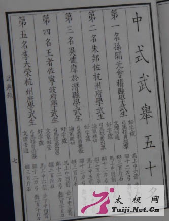 分四级考试 清代武举依文榜程序,考试大致分四个等级进行。(1)童试:在县、府进行,考中者为武秀才。(2)乡试:在省城进行,考中者为武举人。(3)会试,在京城进行,考中者为武进士。(4)殿试:会试后已取得武进士资格者,再通过殿试(也称廷试)分出等次,共分三等,称为“三甲”。一甲是前三名,头名是武状元;二名是武榜眼,三名是武探花。前三名世称为“鼎甲”,获“赐武堤及第”资格。二甲十多名,获“赐武进士出身”资格。二甲以下的都属三甲,获“赐同 殿试及授职 殿试的规格很高,一般由皇帝亲自主考。考试揭晓后,在太和殿唱名,西长安门外挂榜,并赐给武状元盔甲。然后由巡捕营护送武状元归第,炫耀恩荣。第二天,在兵部举行盛大的“会试宴”,又赏给武状元盔甲、腰刀等,赏给众进士银两等。清代科甲等级差别甚大,同样是武进士,一、二、三甲的等级和荣誉却大不相同。状元自然是出尽了风头,登第后的三天内,可以披红挂彩,上街夸官,真所谓春风得意,风光十足。殿试以后,通常立即由兵部授予官职。 顺治三年(1646)丙戌科是清朝武举第一科。当时规定武状元授正三品的参将,武榜眼授从三晶的游击,武探花授正四品的都司。二甲授正五品的守备,三甲授从五品的署守备。康熙年间又有变动,改为一半授营职,是直接带兵的官;另一半授卫职,是皇帝的宫廷侍卫。雍正五年(1727)规定,武状元授御前一等侍卫,武榜眼、探花授二等侍卫,再从二甲中选头十名,授三等侍卫,其余全在兵部注册授予守备等营职。雍正以后各朝武进士的授官情况还有一些变化,不过所授品阶基本上以康熙朝定制为准,没有太 考试分三场 清朝武举各级考试,通常每三年举行一次,每科录取人数也有定额。但常科以外,还时常增设所谓“恩科”,常额以外,也增加一点“恩额”。这类“恩科”、“恩额”都由皇帝直接掌握。无非笼络人心,吸收更多的武勇人士为统治者效命。考试办法差不多与明代一样,分一、二、三场进行。一、二场试了弓马技勇,称为“外场”;三场试策论武经,称“内场”。一场试马上箭法,驰马三趟,发箭九枝,三箭中靶为合格,达不到三箭者不准参加二场。乾隆年间,一场又增加了马射“地球”,俗称“拾帽子”,专为考察伏射能力。 二场考步射、技勇。步射九发三中为合格,所谓“技勇”,实际上主要测膂力。一共三项。头项拉硬弓,弓分十二力、十力、八力三号,另备有十二力以上的出号弓。应试者弓号自选,限拉三次,每次以拉满为准。二项舞大刀,刀分一百二十斤、一百斤、八十斤三号,试刀者应先成左右阅刀过顶、前后胸舞花等动作。刀号自选,一次完成为准。第三项是拿石硕子,即专为考试而备的石块,长方型,两边各有可以用手指头抠住的地方,但并不深,也分为三号,头号三百斤,二号二百五十斤,三号二百斤。考场还备有三百斤以上的出号石硕。石号应试者自选,要求将石磺提至胸腹之间,再借助腹力将石硕底部左右各翻露一次,叫做“献印”,一次完成为合格。凡应试者,弓刀石三项必须有两项为头号和二号成绩,三号成绩未超过两项者为不合格,取消三场考试资格。 三场是考文,当时叫“程文”,也称“内场”,相当于文化课考试。内场考试对大多数武人来说,比外场考试更难应付,所以考试办法不得不屡有变动。最初是考策、论文章,“策”相当于问答题,“论”是按试题写一篇议论文。顺治时定为策二篇、论二篇,题目选自四书和兵书。慷熙年间改为策一篇、论二篇。策题出自《孙子》、《吴子》、《司马法》三部兵书,论题只从《论语》、《孟子》中出,考试难度有所降低。乾隆时又改为策一题、论一题,题目都选自《武经七书》。到嘉庆年间,考虑到武人多不能文,所考策论多不合格,而不少外场成绩突出者又往往败于内场,于是干脆废除策论,改为按要求默写《武经七书》中一段,通常只一百字左右。这样一味迁就,使内场考试的水平越来越低,最后差不多只是形式上的存在罢了。当时社会上歧视武人之风极盛,经此一改,武人更加被文士们看成粗鲁武夫,武举的社会地位大不比清代前期的弊病了。 [page]  武到了科举文武 分途不利于造就兼备人材的问题。他曾要求打破考试中的传统界限,允许文武生员举人交叉考试,武科举人可以改考文科进士,文科举人可以改考武科进士。康熙认为:“如此则各得展其所学,文武两途,皆得真才矣。”然而,整个清代,文武交叉考试者寥寥无几。文武各成畛域而壁垒森严的现象越来越严重,文人不武,武人不文,文武兼长的人材也就越来越少。文武分途的考试制度培养了大批专门人材,却很难造就出亦文亦武的博通人材,应该说这是科举制度的弊端之一,也是清朝中后期政坛上出将人相之人材日见匮乏的原因之一。 鸦片战争以后,频繁的御侮战争中,早就显露出武举人材不能适应新的战争,除了长矛大刀与坚船利炮之间的差距外,更重要的还是基本素质和军事思想上的差距。然而,朝野上下株守陈规,武举考试竟一直被延续下去。光绪二十一年,荣禄首先提出废止武举考试,主张各省创设武备学堂,以西洋军事课程培养新式军人。遗憾的是,荣禄的倡议并没有得到大多数朝臣的响应,一拖几年,光绪二十四年照例举行武举会试——这是中国历史上最后一次武会试。不久,要求改革的呼声又一次响了起来,直到光绪二十七年(1901),武举制度才终于被宣布