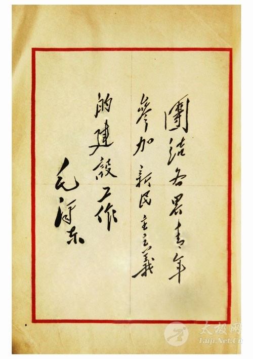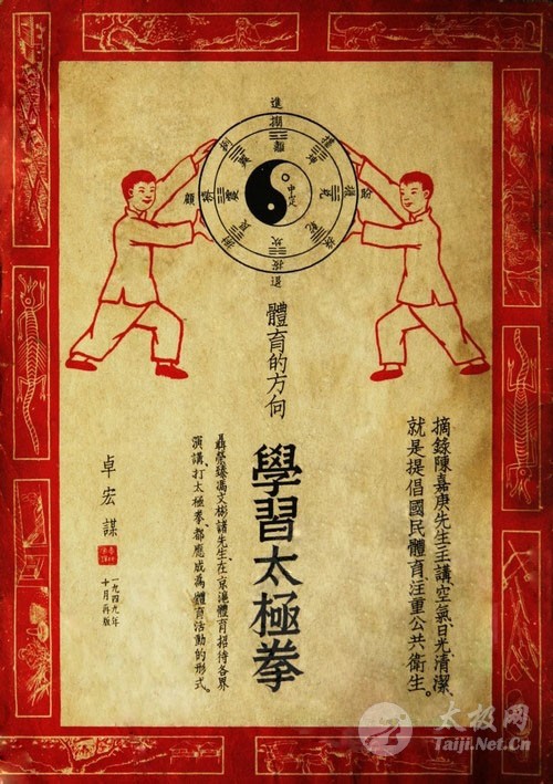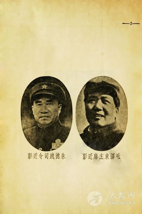 太极拳的形成与发展也就是三四百年的时间,而这其中就包括了我们中华人民共和国建国的60年,因此,相对来说,我们建国后太极拳的发展也经历了不短的时间。这个阶段里,太极拳由小范围、小规模传播转变成为大范围、大规模传播的大好局面,其功效作用和意义也随着铸剑为犁的大环境产生了较大变化。当然,所有这些和祖国的进步繁荣、时代昌明是分不开的了。 现在,我们欣喜地看到,太极拳正在世界各地给很多人们带来健康和欢乐。感谢这个时代吧!感谢我们祖国60年的丰功伟业,经历了这一甲子轮回,我们中华民族必会将迎来一个更加美好的未来。 下面,就让我们在一张张凝结了多种情感、能引发我们无限遐想的历史图片中来回顾新中国60年太极拳的发展历程。 一、1949年十月再版的《学习太极拳》。书中有毛泽东、朱德、沈钧儒的题词和毛泽东、朱德肖像。