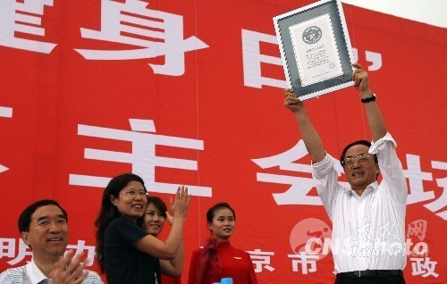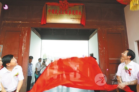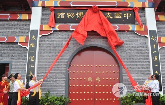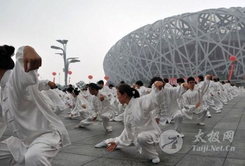2007年8月21日,国家体育总局副局长冯建中(右)、国家体育总局武术运动管理中心党委书记何青龙(左)等领导为“中国武术太极拳发源地”揭牌。 三十一、央视《武林大会》陈式太极拳全国总决赛  2008年4月1日,康龙央视武林大会陈式太极拳全国总决赛,总擂主王战军。 [page] 三十二、2009年太极拳表演破纪录   全民健身日主会场太极拳表演破吉尼斯世界纪录 8月8日是全国首个“全民健身日”,为纪念北京成功举办奥运会、残奥会一周年,进一步弘扬奥运精神,迎接建国六十周年,全国“全民健身日”活动启动仪式北京主场——北京市万人太极拳表演破吉尼斯世界纪录在奥林匹克公园庆典广场及景观大道举办、并成功创造了新的吉尼斯世界纪录。 万人共打24式太极拳的吉尼斯世界纪录是30648人,于2004年4月1日在中国河南洛阳市第22届洛阳牡丹节开幕式上产生,整个表演共用时16分40秒。 本次万人太极拳表演破吉尼斯世界纪录活动组织了34000人的太极拳表演队伍,来自中央国家机关、城八区等28家组织单位,动员了40个中央和市属的局委办机关、事业单位,10所高校,30多家企业,60多家俱乐部,200多个社区的居民,多家社会团体组织、研究会等参演单位。表演队伍涵盖了工农商学兵代表,还有200多残疾人代表,90多名部级和局级领导干部和12名武术明星、世界冠军等。 上午8点,主会场活动正式开始,尽管天空下起雨来,但是现场的气氛并没有受到影响,反而为现场的太极拳爱好者送来了一丝清凉。6分钟的表演之后,经过最终确认,共有33996人完成表演——成功打破了吉尼斯世界纪录。 该项活动由国家体育总局、中共中央精神文明办、北京市人民政府、中华体育总会主办,北京市体育局承办,是一项规模大、影响大、具有中华民族传统特色的群众品牌活动。 三十三、2009年8月20日,第五届中国•焦作国际太极拳交流大赛开幕  本届交流大赛吸引了来自40个国家、3个地区的236支队伍3038名太极拳爱好者参加,其中境外代表队80支409人,境内代表队156支2519人,参加国际太极拳高峰论坛110人。无论是参赛国家、代表队,还是参赛人数均超过以往任何一届。 三十四、2009年8月21日中国第一家太极拳博物馆开馆。  中国太极拳博物馆内展示了大量与太极拳相关的历史实物及图片资料,清晰反应了太极拳由萌发到各流派发展成长的各个阶段历史,真可谓400百年太极拳流传发展史尽收眼底。中国太极拳博物馆的建立,将对太极拳文化的传承保护、推广发展起到积极的作用和深远重大的影响。