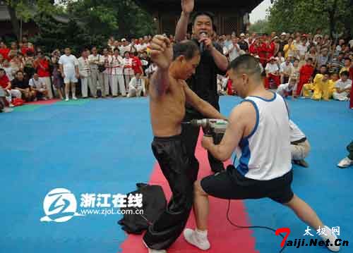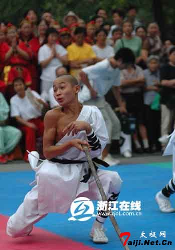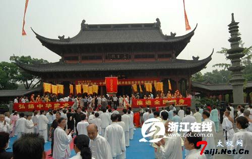 昨日8时,杭州钱王祠内3000余名太极拳爱好者在杭州武协副会长赵荣福的带领下演练起了太极导引功,继今春杭州民间武术绝技交流观光活动之后,2006杭州秋季民间武术绝技交流观光活动再次重燃“战火”。作为秋季活动的重头戏,“中外拳王争霸赛”将在金秋十月揭幕。为备战本次大赛,杭州市武协从为数众多的报名者中,精选拔了40名综合素质较好的选手,参加本月9日开始的国内选拔。赛后,各级别冠军将组成“中国杭州武术精英队”,通过最终筛选的选手,将迎战来自俄罗斯、日本、韩国、泰国以及港、澳、台地区的搏击高手。