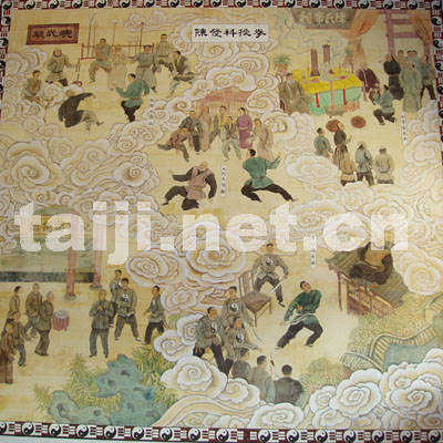 从拳谱堂两侧的月门进入,后院原来别有洞天。两侧为太极拳祖祠东西配殿,里面是太极拳故事壁画展览,皆由省内名家精心绘制,人物刻画细腻,动作精到传神,情节曲折生动,具有极高艺术价值。从《陈王廷创编太极拳》到《双英破敌陈家立规》,从《陈敬柏山东扬威名》到《陈家沟村叟显英雄》,从《陈耕耘押镖亮神手》到《武节将军屡建奇功》,从《杨露禅偷学太极拳》到《各流派传承大发展》,形象记录了太极拳的沧桑巨变。