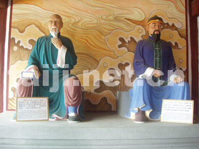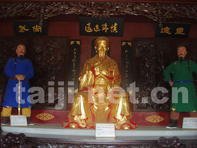 陈有本(右)、陈鑫塑像 拾级而上祖师殿,殿内供奉着太极拳始祖陈王廷和历代太极拳大师的牌位。正厅神台上端坐着2.8米高的陈王廷塑像,左右有陈汝信、陈所乐两弟子立身相陪,后面为春、夏、秋、冬四季习武仿古雕屏。在袅袅的香火青烟中,我们仿佛看见,在明末清初的动荡年代,身负绝技的陈王廷怀才不遇,虽隐居乡间犹心存家国,在祖传拳术和多年研究民间武术的基础上,大胆创新研造新拳。我们仿佛听见,他在低吟着自作的《叙怀》:“叹当年,披坚执锐,扫荡群匪,几次颠险。蒙恩赐、枉徒然。到而今年老残喘,只落得《黄庭》一卷随身伴。闷来时造拳,忙来时耕田。趁余闲,教下些弟子儿孙,成龙成虎任方便……”
