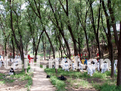 走过山门,首先映入眼帘的是太极灵池。池内旋转缠绕的清浊水流,正像变幻莫测的太极图,为人们阐述着刚柔相济、阴阳互生的哲理。往前是东西两道碑廊,这里有太极拳诸家弟子为自己的恩师们勒石敬立的功德纪念碑。当年求学若渴的入门弟子,俱已成为当今武林英豪,他们怀着无比崇敬的心情,在这里立下了一通通张扬太极拳魂、旌表恩师业绩的纪念碑,也继承了中华民族尊师重道、饮水思源的优秀传统。
