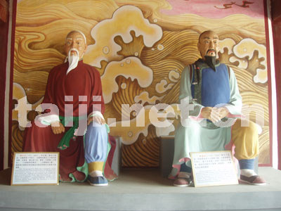 进了村庄,我们迎面就可以看见,主街东西两座牌楼巍然耸立,其间就是太极拳祖祠——纪念太极拳始祖陈王廷和历代太极拳大师的武林圣地。祖祠山门建筑别致,两侧分别为河洛太极图和伏羲太极图,演绎着太极图说与太极拳理之间极其密切的内在关系。战国时期成书的《易传·系辞上》记载:“易有太极,是生两仪,两仪生四象,四象生八卦。”陈王廷正是在潜心研究太极原理之后,才创造出了集技击、健身、养生为一体,运行人体气道的神秘武学太极拳。