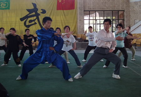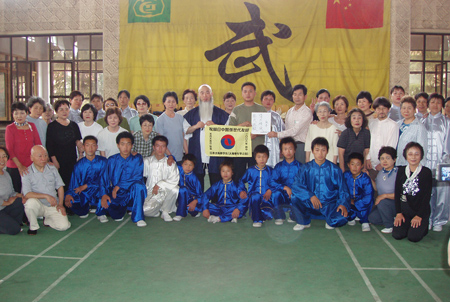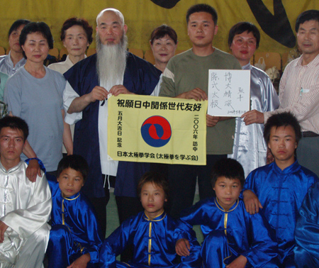 今天上午,日本太极拳学会一行四十人莅温旅游学习,在完成了对陈家沟的太极拳寻根之后,下午一时左右到达太极武术馆,首先观看了太极武术馆培训中心学员的精彩表演,并且饶有兴趣的学习了一小时的正宗陈式太极拳。 临行,一位美髯长者拿出了早已准备好的写着“祝愿日中关系世代友好”的标语和各位学员、教练员合影留念,表达了日本普通民众对中日友谊的渴望,他们说,太极拳是增进日中友谊的桥梁和纽带。