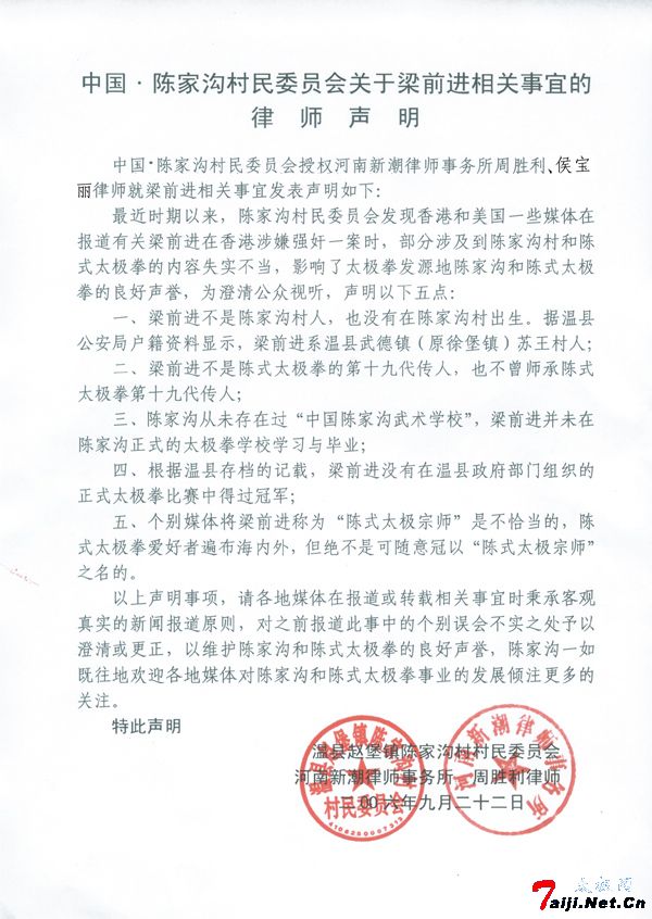 (文字) 中国·陈家沟村民委员会授权河南新潮律师事务所周胜利、侯宝丽律师就梁前进相关事宜发表声明如下: 最近时期以来,陈家沟村民委员会发现香港和美国一些媒体在报道有关梁前进在香港涉嫌强奸一案时,部分涉及到陈家沟村和陈式太极拳的内容失实不当,影响了太极拳发源地陈家沟和陈式太极拳的良好声誉,为澄清公众视听,声明以下五点: 一、梁前进不是陈家沟村人,也没有在陈家沟村出生。据温县公安局户籍资料显示,梁前进系温县武德镇(原徐堡镇)苏王村人; 二、梁前进不是陈式太极拳的第十九代传人,也不曾师承陈式太极拳第十九代传人; 三、陈家沟从未存在过“中国陈家沟武术学校”,梁前进并未在陈家沟正式的太极拳学校学习与毕业; 四、根据温县存档的记载,梁前进没有在温县政府部门组织的正式太极拳比赛中得过冠军; 五、个别媒体将梁前进称为“陈式太极宗师”是不恰当的,陈式太极拳爱好者遍布海内外,但绝不是可随意冠以“陈式太极宗师”之名的。 以上声明事项,请各地媒体在报道或转载相关事宜时秉承客观真实的新闻报道原则,对之前报道此事中的个别误会不实之处予以澄清或更正,以维护陈家沟和陈式太极拳的良好声誉,陈家沟一如既往地欢迎各地媒体对陈家沟和陈式太极拳事业的发展倾注更多的关注。 特此声明 温县赵堡镇陈家沟村村民委员会 河南新潮律师事务所 周胜利 侯宝丽律师 二OO六年九月二十二日 |