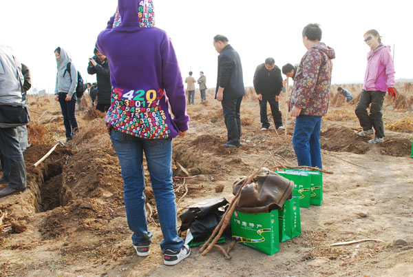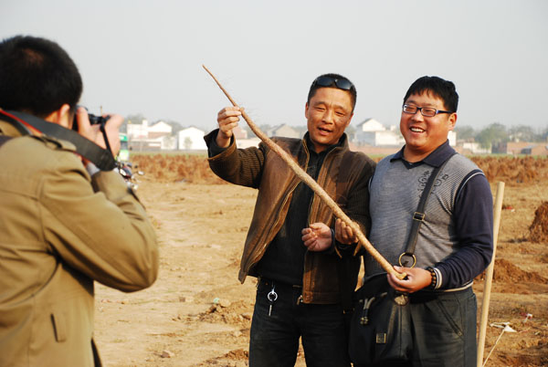 网友们的热情很高,有的人甚至躺进沟里摸索,目的为了不让山药断掉。刚开始的时候大家都不很得窍,既小又不完整,随着慢慢熟练,一根根完整粗大的山药不断被挖出,围观的人群里不时爆发出阵阵欢呼声。最后大家还自发的组织了一次比赛,看谁挖的山药长,并且评比出了前十名。