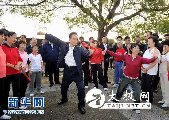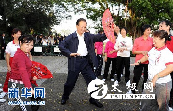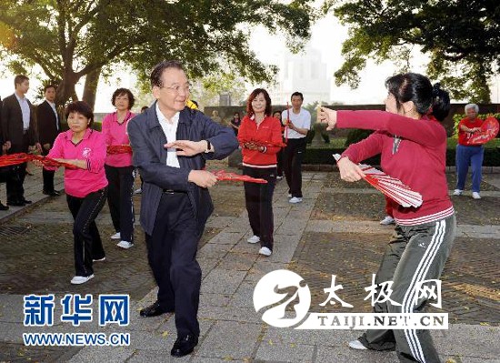 11月14日,国务院总理温家宝来到澳门大炮台花园,同在这里晨练的市民亲切交流,一起练习太极拳并学练太极扇。