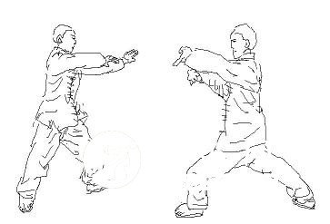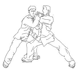甲乙双方在旋转、缠绕对抗之中,乙松右胯,身体略稍右转,并将甲的左手向下按,使之置于对方小腹前,随即向右外拨动,然后继接迅速提起左手向前