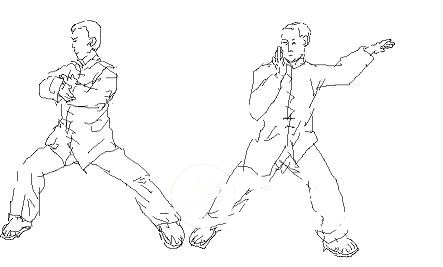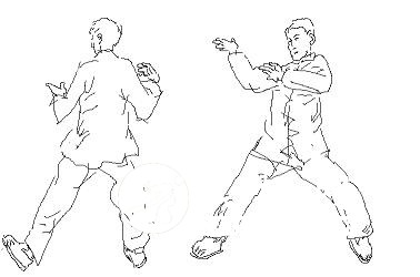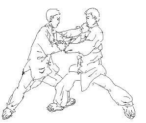 6、乙恰在甲欲提手倒步的同时,松左胯,重心左移,然后提抬右脚,跟随甲上领之势向前上步,落步到甲左腿内侧。双方两膝相接。