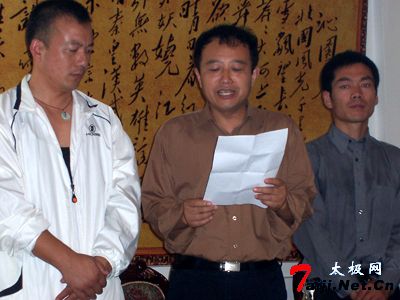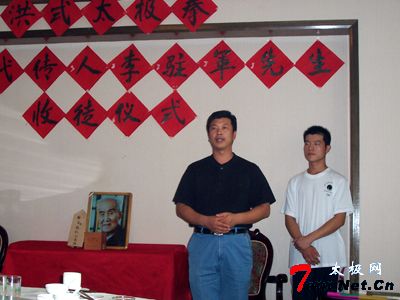 李驻军老师向新入门弟子训话 张勇、王镇等同学是在跟随李老师学拳很长时间后,经过老师考察,认为人品好又能刻苦练习太极拳,能够继承洪派艺术而被老师收为正式徒弟。收徒仪式上,李老师向新入门的弟子颁发证书并介绍了洪式的源流、发展,以及近年来所取得的成绩,鼓励他们献身太极事业,为人类健康工程做贡献! 李老师的师兄弟高富宽、马菏东、马保国、郑关中、李雷等先生作为引进师和见证人参加了收徒仪式。何淑淦先生因故未能参加这次活动,专门委派弟子荣捷宣读贺词。济南等各地洪式同门闻听信息后也纷纷来电祝贺!