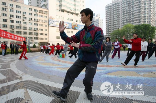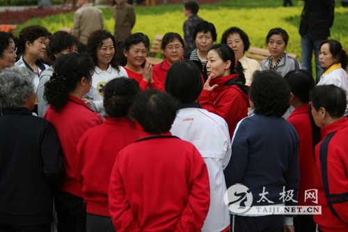 5月10日,杨氏太极拳亚洲冠军杨静(中)向武术爱好者讲授太极拳法 5月10日,杨氏太极拳亚洲冠军杨静(前)带领武术爱好者研习太极拳法 5月10日,杨氏太极拳传人、中国武术八段崔仲三(前)向武术爱好者讲授太极拳法