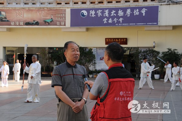 第二天 六月四日早上醒来,听到窗外小鸟在欢快的唱歌。昆明真的是个好地方,不仅天气四季如春,而且常年鲜花盛开,到处绿树成荫。我们住宿的西南宾馆,院内亭台楼阁,错落有致,鸟语花香,还有小桥流水,安静舒适。简单洗漱,接我们的车子已等在楼下。早上七点半在内地街上应该已是人流如潮了,上班和上学的人形色匆匆,可昆明的大街上却安安静静,偶尔看到一两个行人。也是不慌不忙悠然自得。 来到武馆,太极拳协会的会员们已在练习太极拳,曾秘书长召集大家,为我们做了简单介绍,拍摄工作就正式开始了。在刘忠维老师的带领下,曾秘书长和各个副会长还有会员组成了方阵整齐划一的练了一套太极拳老架一路,我们的摄像拍了全景又拍了特写。并且完成了对分会名誉会长(原昆明市副市长)陈思雄先生以及学生黄焕章、杨晓慈、尹学友的采访,陈先生赞道:陈式太极拳协会云南分会为昆明市太极拳的普及及群众性健康运动做出了很大贡献,因为健康是人类永恒的追求,由于协会高的教学很灵活,随时可以学,使得很多上班族也可以利用业余进行太极拳的学习,增加了群众参与的积极性。学生们还就练太极拳以来身体得到的锻炼和康复以及老师手把手孜孜不倦的教导表示了衷心的感谢。 左起:李强华 曾加华 刘胜元 名誉会长(原昆明市副市长)陈思雄接受采访 |
