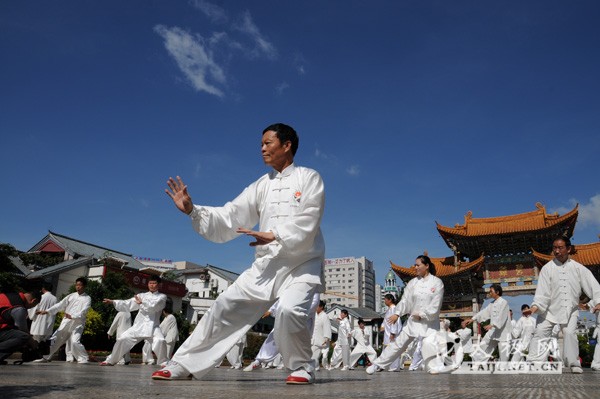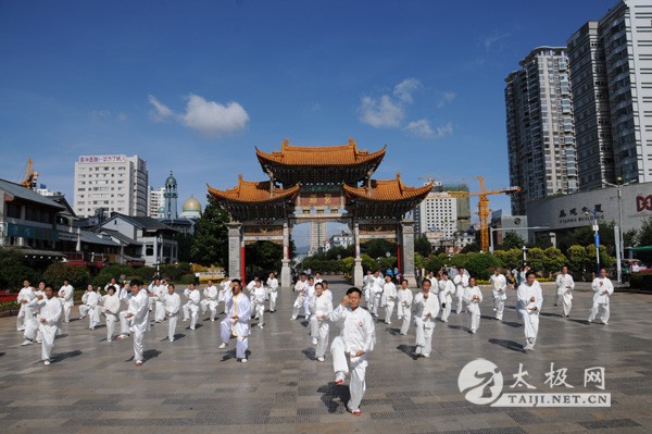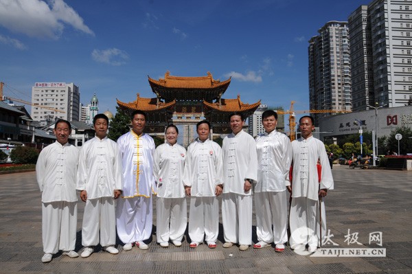 刘忠维会长带领会员在金碧广场习练 拍摄的第二个场地是在金马碧鸡坊。金马碧鸡坊位于昆明市中心三市街与金碧路汇处,高12米,宽18米,雕梁画栋精美绝伦,东坊临金马山而名为金马坊,西坊靠碧鸡山而名为碧鸡坊。北与纪念赛滇池的“忠爱坊”相配,合称“品字三坊”,成为昆明闹市胜景;南与建于南诏的东西寺塔相映,显示了昆明古老的文明。东坊临金马山而名金马碧鸡坊始建于明朝宣德年间,至今已有近四百年的历史。有着厚重历史文化的广场上,一段集体演练中华国粹传统太极拳,使围观群众开了眼界,感受到太极拳的魅力。 部分骨干教练员合影 |