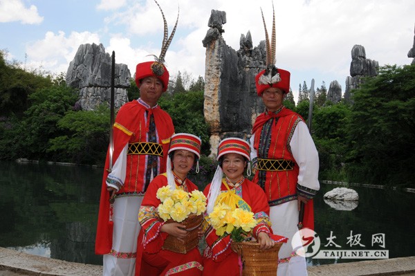 石林又因电影《阿诗玛》而闻名全国,景区的导游都是漂亮的阿诗玛,我们除了争着和美丽的阿诗玛合影外,索性自己也穿起了阿诗玛和阿黑哥的民族服饰,秀了一把撒尼族的多情男女,一直拍摄到了下午三四点钟,所需的镜头基本拍好。在这几天的拍摄当中,深深的被各位老师感动着。刘忠维会长的稳健慈祥;曾加华秘书长的细致干练;李小华副会长及其堂弟的每天辛苦接送;李华强副会长、陆副秘书长、杨副会长等的热情陪同招待都给我们留下了深刻的记忆。最难忘的是七十四岁高龄的老顽童刘胜元老先生,他对太极拳的迷恋,他对待生活的态度,他对待老师和拳友的真诚。从不把自己当老年人,整天乐乐呵呵的,我们在昆明的几天里,整日不顾辛劳陪着我们,不管是上山还是看海,从来没有落下过。他的老有所学,老有所乐精神值得我们学习。