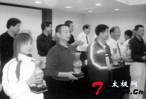 2006年,在市委市政府和有关部门的关心及大力支持下,素有“武术明星的摇篮、体育冠军的基地”之称的芜湖少林文武学校,在教育和比赛中都取得了丰硕的成果,特别在有关的比赛中,成为我市夺取体育和武术奖牌的大户。 至今为止,芜湖少林文武学校已在国内外各项各类武术大赛上获得奖牌344枚,其中金牌104枚、银牌106枚、铜牌134枚。2006年,在省政协委员、校长李俊录的带领下,全体师生发扬更快更高更强的奥林匹克精神,为弘扬光大中华传统武术,不畏艰难,不怕苦和累,刻苦训练,勇于拼搏,勇于奋斗,再创历史新高,为体育强市的目标早日实现,做出了卓越的贡献。 2006年,芜湖少林文武学校各项赛事收获颇丰,共获得金牌26枚、银牌18枚、铜牌20枚、团体冠军2个、体育道德风尚奖3个。其中,武术套路参加了第四届香港国际武术节,安徽省武术馆校比赛,芜湖市青少年运动会武术比赛和在山西运城举办的全国民间传统武术大赛,共获得了金牌15枚、银牌16枚、铜牌16枚、团体冠军2个、体育道德风尚奖1个;武术散打在全国散打王锦标赛,全国拳王争霸赛,安徽省武术馆校散打比赛,安徽省第十一届运动会散打比赛中共获得金牌8枚、银牌2枚、铜牌3枚、体育道德风尚奖1个;并且,芜湖少林文武学校还首次成功地组织了第一届皖南地区跆拳道邀请赛,受到了各参赛方的好评。 在安徽省第十一届运动会上,芜湖少林文武学校也组队代表芜湖市参赛,取得了优异成绩,共获得金牌3枚、铜牌1枚、体育道德风尚奖1个。 图为李俊录(前排左二)代表芜湖少林文武学校代表队,在2006年全国民间传统武术大赛的领奖台上领奖。 |