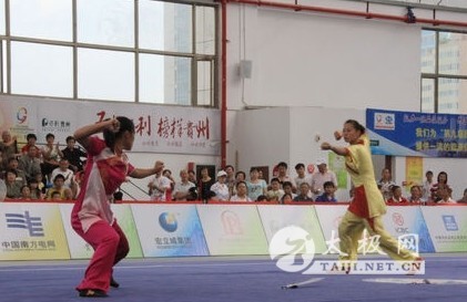![]() 14日上午,少数民族武术男子对练和女子对练决赛在贵州省全民健身综合馆举行,由王明强、王超和韩晋组成的甘肃武术男子对练队,以及由杨学婷、耿丽颖和张蕊组成的天津队,分别以以9.26分9.15分获得第一名。至此,本届少数民族运动会武术项目的比赛全部结束。