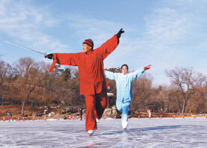 张宝柱老人和他的学生邢桂珍一起练习自创的“冰上太极剑” 如今在城市的健身一族中,练太极剑的人不少,喜欢滑冰的人也不少,可是,将太极剑与滑冰融为一体的“冰上太极剑”您见过吗?近日,记者在承德避暑山庄的芳园居冰场上,就见识了这一新式剑法。 冰面上,一位老人格外引人注目。他手持宝剑,脚蹬冰鞋,在优美的音乐伴奏下缓缓滑行,时而剑指苍穹,时而提膝独立,动作轻灵柔和,舒缓潇洒,既流淌出花样滑冰的美感,又蕴含着太极剑术的力道,令人赏心悦目。