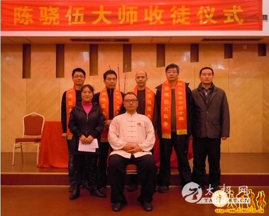 陈骁伍先生首先焚香祭拜太极先贤,随后,新收弟子依次按照传统方式拜入门下。仪式在轻松、和谐,但又不失庄重的气氛中进行。师父正襟端坐,笑意盈盈,新收弟子虔诚敬茶,叩首致敬。每一句“师父请喝茶”都发自内心,这种自然的尊重和敬意,以及师徒间的亲近感,无处不体现了传统武术中师徒特殊的深情厚谊。 陈骁伍先生是河南焦作人,中国太极拳名家,槐园太极拳社社长,并在全国各地众多家武术协会,太极拳协会担任总顾问、总教练。其名已被收录在山东恽城县志,和江苏丰县县志。陈骁伍先生自幼酷爱武术,传自家学太极拳。艺精功深,在数十年的实践之中,结交众多武术界良师益友,德艺双馨。多年来培育了不少武术人才,至今举行收徒仪式不计其数,今天,陈骁伍先生又在台州椒江中天大酒店举行收徒仪式,为的就是要将一身精湛的武艺广传有缘人,发扬光大槐园太极拳文化! 出席仪式的嘉宾有来自各行业的领导,有企业主,有师姐、师兄,也有武术爱好者,以及对陈骁伍先生高深武艺的仰慕者。大家共同见证和参加了这一场传统的收徒拜师仪式。