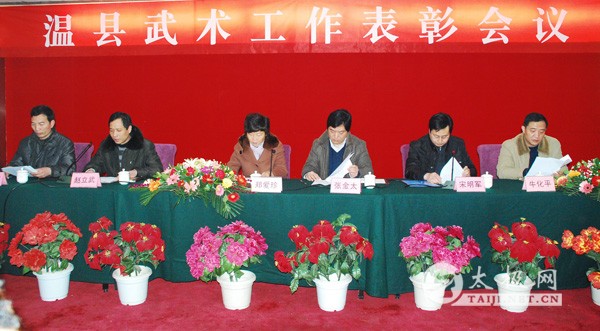 来自全县的武术馆校、社会团体、辅导站负责人和太极拳师等济济一堂,会议总结了2010-2011年度的武术工作,并对2012年的武术工作做了部署。 温县体育局局长宋明军在讲话中说:近两年来,温县的武术工作在县委县政府的领导下,多措并举,扩大了太极拳的影响。承办了各类赛事活动,特别是陈家沟太极拳邀请赛规模和规格创下了历届赛事之最,得到了广泛好评。陈家沟武术院组队参加“央视武林大会 太极拳对少林”、“太极拳对日本空手道”比赛,取得了骄人成绩,为温县争了光。 宋明军在讲话中总结了成绩的同时,还指出了温县武术工作存在的一些问题,明确了今年的工作重点。宋明军要求太极拳工作者,要把握太极拳发展的良好局面,适应新时期温县武术事业发展的需要,为推动太极拳事业的发展,热爱家乡,奉献家乡,以实际行动为温县经济发展做贡献。 温县体育局纪检书记牛化平宣读表彰武术先进单位和个人的决定。