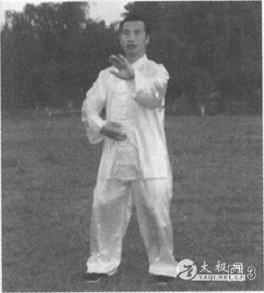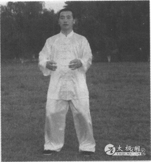 缠丝劲表现在身上时,胸腹相合(气归丹田)为顺缠,如单鞭之提左膝收脚,胸腹相开(气出丹田)为逆缠,如单鞭之左脚偏左后出步。胸腰螺旋左转即左侧为主缠丝,胸腰螺旋右转即右侧为主缠丝,身躯缠丝即胸、腹、腰、脊皆缠丝。      金刚揉球(交叉缠丝)      动作一:面向正南而立,两脚平行开步,约与肩宽,两脚尖不丁不八,两踝松竖合住劲,双脚十趾抓也,涌泉穴空,两膝开合相寓,两胯放松,裆圆虚,尾间回收,命门后撑,垄胸实腹,气沉丹田,两肩放松,自然前卷,两臂垂于体侧,立身中正,虚领顶劲,两眼向前平视,精神内敛,外示安逸,呼吸自然,以静待动。如图(1)所示。       要点:站立时,头要正直,颈要松竖,下颌要微收,口微闭,齿轻合,舌尖微顶上腭。在身正体松,意志专一的情况下,深刻体会内外合一动由静生的道理。      动作二:胸向不变,两腿屈膝松胯,身体微沉,腰劲下塌,顶劲上领,同时双手在大腿两侧塌掌根,略双顺缠缓缓上提,双手略里折腕,指尖相对,虎口圆虚,两手的大小指相合,劳宫穴空,成瓦垅掌型,两掌的掌心相对相系,环抱于腹前中线两侧,如抱球势,立身中正,虚领顶劲,松肩坠肘,两臂拥圆,胸向南,眼视前方。如图(2)所示。       要点:双手上升的同时身体要下沉,不要一上都上,要做到有上有下,两肘尖(鹰咀骨)要下坠,注意肘不贴肋,两胯要松透,使两个胯窝凹进去,感觉小腹像坐在大腿上一样,切不可低头弯腰。      动作三:胸腰螺旋右转,松右胯翻左臀,裆走后下弧重心左移,右腿顺缠蹬劲,左腿逆缠合劲,两膝开合相寓。同时,左手自腹前中线左侧塌掌根逆缠走弧线向前拥出至胸前中线,斜立掌,掌心向前,略突出大鱼际,右手自腹前中线右侧塌掌根顺缠收至右腹前,成横掌,掌心向上,略突出小鱼际。立身中正,虚领顶劲,松肩坠肘,两臂拥圆,胸向西南,眼视前方。如图(3)所示。       要点:双手在螺旋缠丝时,两腋下不可夹死,要保持圆虚,双脚不可乱动,要抓住地蹬      上劲,重心倒换时会阴穴要下沉,裆部要走后下弧,不能直接扛过去,双手的位置不要离开中线。  |