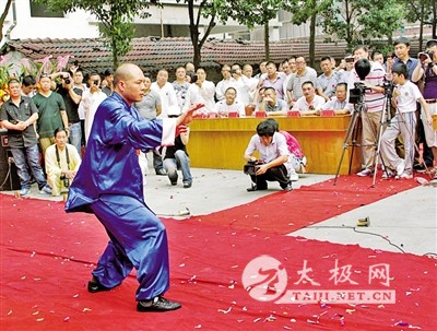 2012年6月12日,瓯北陈氏太极会馆经过半年的筹备终于开馆迎客。据悉,长期以来由于缺乏一个室内练拳场所,遇到刮风下雨的天气广大拳友只能放弃练习,深感不便。今年年初,在多位企业家的鼎力相助之下创办了一个室内太极会所。图为2010年全国太极拳六大门派总决赛冠军王占军现场演示陈氏太极拳。  |