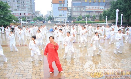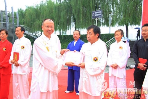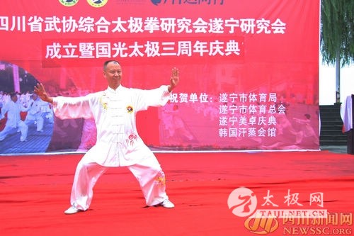 郭光给四川省武协综合太极拳研究会遂宁研究会成员颁发聘书 9月16日上午,四川省武协综合太极拳研究会遂宁研究会成立暨国光太极三周年庆典在遂宁犀牛堤隆重举行,省武协会综合太极拳研究会会长蒋勇出席活动并为遂宁综合太极拳研究会授牌,参加活动的还有来自四川各地武术太极拳爱好者。 太极拳历史悠久,是中华民族的宝贵财富,是一项老少皆宜的体育活动,不仅深受国人的喜爱,而且还深受外国人的青睐,曾被外国人称之为是我们中华民族对世界的第五大贡献。 郭光在台上展示太极拳 活动现场,太极拳爱好者在打太极拳 记者了解到,遂宁国光太极于2009年9月成立,目前已初具规模,并取得了一定成就。2010年7月参加第八届北京国际武术赛中荣获4金1银;2011年3月参加第九届香港国际武术节荣获1金2铜;2011年8月以“遂宁体育局-国光太极”代表队参加中国四川国际峨眉武术节荣获3金6银13铜,2012年6月参加四川省太极拳锦标赛获1金1银1铜,奖牌总数超30枚的好成绩。现遂宁市区已设立7个太极拳培训点,累计培训人数近千人次。 据介绍,最近国家体育总武术管理中心提出了太极拳段位制“六进”的要求,并要进一步在民众中推广、普及太极拳。为此,四川省武协太极拳遂宁研究会的成立,适应了这一形势的需要,必将为遂宁地区推广、普及太极拳做出积极贡献。 庆典仪式上,四川省武协综合太极拳遂宁研究会会长郭光表示,遂宁综合太极拳研究会将紧跟四川省武协综合太极拳研究会,不断学习,与其它研究会不断交流学习,积极参加遂宁市体育局及武术协会、太极协会举办的各项活动。同时培养出更多的教练,设立更多的太极拳培训点,并辐射到区县,让更多的市民方便就近学习太极拳,提高身体素质,造福民众健康,让更多的人参与到太极运动中来,以展示国民之健康体魄,弘扬中华之太极风采!立足遂宁,发展四川,影响全国,走向世界,为国争光! 活动当天,太极拳爱好者们带来了各式太极拳、剑以及功夫拳、扇的表演。 四川各地太极爱好者在犀牛广场冒雨打太极 四川省武协综合太极拳研究会会长蒋勇为遂宁研究会授牌 |