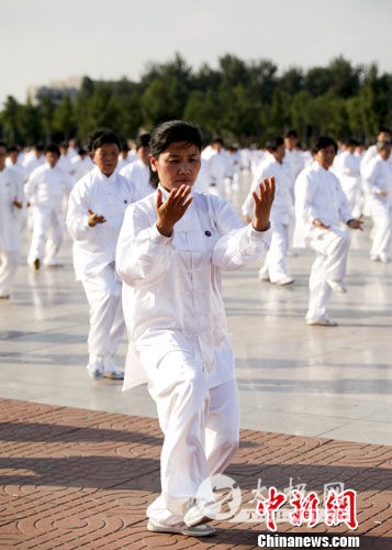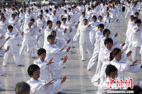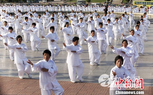 9月16日,山东省临淄区上千名群众共同展示中国传统武术——太极拳。中新社发 崔立来 摄 作为目前全国唯一的“全国太极拳健身特色区”,山东临淄已在256个村居、社区建立太极拳辅导站,占到全区所有村居、社区的70%,太极拳协会正式注册会员突破1万人,带动8万多人常年习练。
