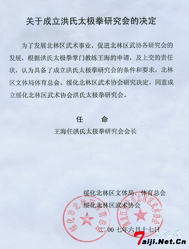 2007年6月17日,黑龙江绥化洪式太极拳研究会成立。市文体局长潘跃喜 ,北林区文体局代局长刘拄华, 市文体局群体科长向守礼等领导前来祝贺。李驻军老师弟子王海先生当选会长。