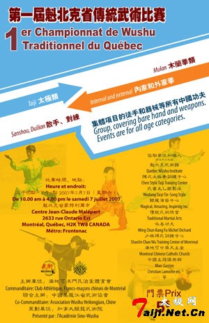 | ——“加拿大魁北克省暨中国黑龙江省武术协会第一届传统武术比赛”即将召开,中国黑龙江省武术协会将派武术专家团前往加拿大讲学 适逢2008北京奥林匹克运动会临近之际,为弘扬中华武术文化,以极具东方魅力的中华武术为载体进行国际间武术文化交流,为了武术进奥运、为奥运会热身,弘扬奥林匹克精神,由加拿大醒龙武术院策划发起,经主办单位”加拿大魁北克省满地可洪门民治党体育会”和联合主办单位”中国黑龙江省武术协会”协商,将于2007年7月7日,在加拿大魁北克省蒙特利尔市联合举办”第一届加拿大魁北克省暨中国黑龙江省武术协会传统武术比赛” (www.SinoWushuAcademy.com / Championship)。 届时,满地可洪门体育会及加拿大醒龙武术院(Sino-Wushu Academy)将邀请中国黑龙江省武术协会秘书长李可言先生、黑龙江省武术协会副秘书长、中国武术段位七段、八极拳第三代传人、吴式太极拳第五代传人张永明师傅及中国武术段位七段、中国十大武术名师李文彬老师的入门弟子、尚派行意门第二代传人、哈尔滨工业大学体育系董平教授做为中加两省武术文化交流的使者莅临大赛进行友好交流。 此次比赛将历时一天,开幕式有大型精彩武术功夫综合表演。竞赛项目包括武术竞赛类、太极类、木兰拳类、传统类、内家和外家拳、散手、对练和集体项目的徒手和器械等所有中国功夫。