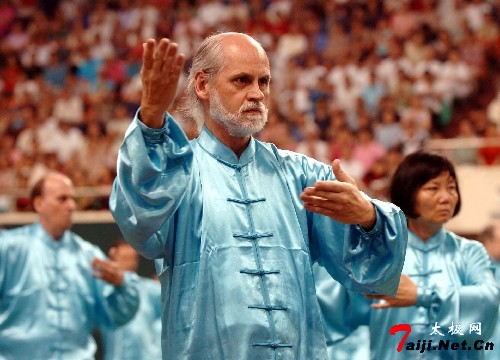 7月14日,参赛的外国运动员在开幕式上表演杨氏太极拳。当日,中国山西第三届传统杨氏太极拳国际邀请赛在太原市滨河体育中心开幕,来自国内外的67支代表队约700名运动员参赛。