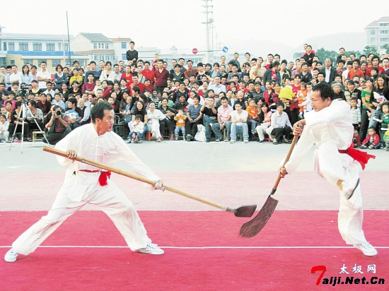 参加全省农民“种文化”百村赛后,七里人的眼光看得更远了。李元荣告诉我们:“光我们一个村学武术还不够,如果在周边普及开来,让更多的农民、居民喜爱,才能传承下去。武术文化不仅要‘种’到邻村,还要‘种’到城里!”在七里村的带动下,邻近的牟村等10个村先后都办起了武术队。今年6月,七里村搭起擂台,办起农民武术节,刀枪剑棍、舞龙舞狮,远近150多位武术爱好者欢聚一堂,吸引了5000多人观看。不少从城里赶来观看的居民围住李元荣等老武师:“到七里村学习武术不方便,是否可以到城里去教?”李元荣等欣然答应。如今,村里30多位武师常赶到黄岩区、椒江区、路桥区等地教授武术。