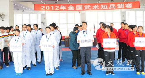 2012年武术短兵调赛12月5日至 6日在武汉体育学院重竞技馆落下帷幕。本次调赛由国家体育总局武术运动管理中心主办,武汉体育学院承办。在全国范围内选调四支代表队参加比赛,赛事共设男子:60公斤级以下(≤60 kg)、60-75公斤级(>60 kg-≤75 kg)、75公斤级以上(>75公斤),女子:58公斤级以下(≤58 kg)、58公斤级以上(>58 kg)五个级别。此次调赛是我中心在举办武术短兵项目发展研讨会后,首次举办的全国武术短兵调赛。其目的有三:一是、检验2012年7月份武术短兵项目发展研讨会上制定的短兵规则的可行性和操作性。二是、探讨武术短兵技术的发展走向。三是、探讨武术短兵礼仪的方式和方法。因此中心领导对调赛高度重视,我中心王玉龙副主任亲临现场指导比赛工作,为广大运动员、教练员、裁判员和工作人员带来了热情的关怀,大大提升了大家的工作热情,对比赛的圆满成功起到至关重要的作用。在承办单位的大力支持与配合下,经多方共同努力,达到了预期目的。