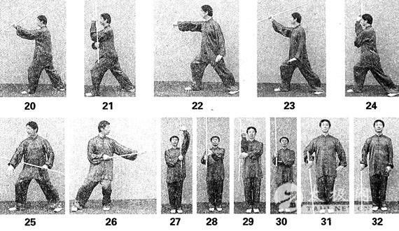 两脚并拢,身体直立,右手持鞭把段,鞭贴于右臂外侧,鞭梢端触地立于右脚旁10公分处,目视前方(图1)。 2、左背 左脚向前上步成左弓步戳,随即右手松开鞭杆,左手握鞭梢段,由下向上甩起,使鞭背在左臂后,随即右手在左肘下接握鞭把段,目视前方(图2-5)。 3、右背 身体重心先略后移,随即右脚向前上步成右弓步,同时左手松开鞭杆,右手握鞭把段,由下向上甩起,使鞭背在右臂后,随即左手在右肘下接握鞭梢段,目视前方(图6-9)。 4、左背 身体重心先略后移,随即左脚向前上步成左弓步,同时右手松开鞭杆,左手握鞭梢段,由下向上甩起,使鞭背在左臂后,随即右手在左肘下接握鞭把段,目视前方(图10-13)。 关于背的实用技法:背是攻防兼备的技法,由下而上的甩可以防劈、防戳、防刺、防击等,同时可以进击腕部、肘部、裆部等。 |