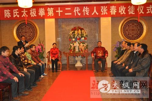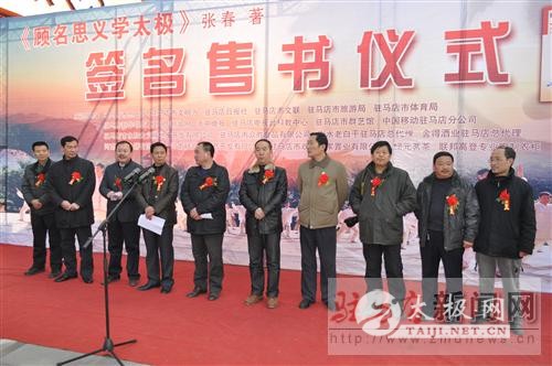 2013年第一天,太极拳大师张春在市新华书店门前热情签售其编著的《顾名思义学太极》新书,场面异常火爆。 市委宣传部副部长、驻马店日报社党委书记、社长刘根社,张春先生分别致辞。现场还举行了太极拳表演,众多太极拳爱好者的精彩而专注的表演吸引了许多路人。签名售书仪式结束后,张春还举行了收徒仪式,弟子在向张春老师跪呈“拜师帖”敬上拜师茶后,正式成为陈式太极拳第十三代传人。 记者了解到,《顾名思义学太极》日前由河南人民出版社出版发行。分为“顾名思义学太极”、“太极拳学习线程图”、“张春123太极拳教学法概述”、“精编十六式陈氏太极拳”、“拳势的应用”、“太极养生、治病与美容”六章,全书洋洋洒洒共18万字,是专为零基础和希望深入者打造的太极拳快速练习法,有专家把书中介绍的线程式标准化定位教学法誉为太极拳驶向世界的“高铁”。 张春简介: 张春1964年出生于河南省驻马店,是陈氏太极拳第十二代传人。张春曾获河南温县陈家沟太极拳推手比赛75公斤冠军,1983年~1985年连续3年担任温县陈家沟太极拳推手比赛首席裁判。他利用力学原理总结出了各派太极拳中的共性,并把它标准化。他首创“太极拳学习线程图”,使欲深入学习者清楚明白要学习的内容。他首次将“角度、公式、定律、法则”引入太极拳教学中,让“怕学不会”的学习者有据可查。他首次利用肌肉记忆原理创造出“太极拳动作定位器”,使零基础学习使用者使用后迅速入门。他创新“太极拳动作检测工具”,开太极拳动作标准化之先河。他创造的“不二法门、三妙法门、四品法门”等“节拍定势法则”引导了太极拳练习中刚柔、快慢的快速实现。他发明了“劲力导航线”来指导推手过程中内力的传递。他打造的“线程式标准化定位快速入门教学法”适合各派太极拳。他把教学法引人了网络视频远程同步教学,打破了地域、时间、空间的限制,解决了零基础者想学太极拳找不到老师、或想学太极拳抽不出时间集中学习的困惑,实现了在家庭、办公室和在健身房接受辅导同样的效果。