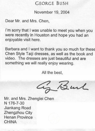 美国前总统老布什与陈氏太极拳的情缘 2005年1月22日,中国太极拳大师陈正雷收到了一封来自美国的信件。信是美国前总统老布什写来的,信中字里行间热情洋溢,又充满歉疚之意。 一个美国前总统为什么会给一个中国公民,给一个著名的中国太极拳大师写信致歉?这个中的一段太极情结还得从2004年10月在中国郑州举办的“首届世界传统武术节”说起…… 华人侨团牵线搭桥安排大师访老布什 2004年10月中旬,由国际武术联合会和中国武术协会主办的“首届世界传统武术节”在中国河南郑州市隆重举行,并取得了圆满成功。当时代表中国国家队参加这次比赛的陈正雷大师参加了传统陈氏太极拳及太极剑两项比赛,他那娴熟的太极功夫得到了在场国内外运动员一阵阵热烈的掌声。陈正雷大师连夺两枚金牌。 中国河南省是中华武术两大重要拳种太极拳和少林拳的发祥地。陈正雷大师就是出生在太极拳的发源地河南焦作温县陈家沟。他是陈氏十九世、太极拳第十一代嫡宗传人。他8岁时就开始随其伯父、陈氏太极拳一代宗师陈照丕学习陈氏太极拳老架一、二路,推手、刀、枪、剑、棍等太极器械及理论知识。40多年的太极生涯他不但练就了一身外柔内刚,炉火纯青的太极功夫,而且致力于太极拳理论研究和太极拳的推广工作。他是迄今为止,中国太极拳界著书立说,拍摄太极影像教育片最多的太极拳家。他在郑州开办了河南陈正雷太极文化有限公司和陈家沟太极拳馆,还建立了陈正雷太极拳网站。同时与有关单位联合生产销售太极拳运动的相关产品。近十几年来他为推广太极拳呕心沥血做了大量的工作。他现任河南省武术运动管理中心副主任,河南省武术协会副主席,国家高级武术教练,国家级社会体育指导员,中国武术协会会员,中国体育科学学会委员,中国当代“十大武术名师”之一。 陈正雷早就声名如“雷”,声名远扬。国内外慕名求学者纷至沓来。长达30余载的教拳生涯,粗略估算,经他亲手教过的学生有数万人之多。 话又得说回到去年在郑州举办的“首届世界传统武术节”,当时在赛场上中国武术的精华南拳北腿,太极少林,武当八卦,刀、枪、剑、棍等十八般武艺悉数演绎得淋漓尽致,吸引了包括中国在内的几十个国家的武术爱好者。但参赛项目中运动员最多的还是各式太极拳的比赛。而其中又以太极拳中的“老祖宗”——陈氏太极拳尤为引人注目,激发了许多外国朋友的极大兴趣。而当时作为国际武术联合会副主席与会的美国国家武术总会会长吴廷贵先生,看到太极拳的如此魅力,又一次特邀陈正雷大师偕夫人路丽丽女士访问美国。 吴廷贵先生系美籍华人武术家,在美国办有自己的武术馆。近些年来他担任国际武联副主席,美国国家武术总会会长,以及泛美武术联合会主席等重要职务,在南北美洲倾心致力于中华武术的发展工作,并为之作出了重要贡献。去年十月,我在“首届世界传统武术节”采访他时,他深情地希望中华武术能成为北京奥运会正式比赛项目,并愿为之而努力奋斗! 早在1983年,陈正雷作为陈家沟第一批出访人员到日本东京、大阪等8城市访问表演。那是他作为优秀运动员及陈氏太极拳嫡宗传人第一次出国传播太极拳。而访美历程就要追溯到1996年。那年,陈正雷就应美国武术院的邀请,随中国“太极讲师团”赴美表演讲学。那是他第一次踏上美利坚的土地传播古老的陈氏太极拳。自那以后,陈正雷几乎每年都要去一次美国交流指导太极拳,深受当地的太极拳社团和众多弟子的欢迎。 这次陈正雷大师访美可与以往有所不同。在吴廷贵先生的精心安排下,一些在美的热心华人和美国友好华人社团通过各种关系,鼎力相助把太极拳不但进一步介绍给美国广大民众,而且也介绍给美国的上层社会,政界要人。这其中也包括美国前总统老布什先生。 原来美国中国人活动中心侨团与老布什家族关系密切,该社团与美国得克萨斯州州政府又有着长久而友好的合作关系。而得州州政府亚太部部长华人沈健生先生本人与美国中国人活动中心侨团的关系非常密切。早在陈正雷访美之前,美中国人活动中心侨团就把陈正雷和陈氏太极拳介绍给了沈健生先生。沈健生先生又将太极文化和陈正雷介绍到得州政府。老布什就是从得州政府了解到陈正雷即将访美的消息的。而老布什在北京当美驻华外交官时对中国的太极文化早有所了解,也曾经学习过中国的吴式太极拳。他知道太极文化的博大精深和太极拳的养生健身效果。老布什退休后,有更多的时间了解陈氏太极拳。因此,当他听说陈正雷要来他的家乡时,便通过州务卿向陈正雷夫妇发出到他办公室做客的邀请。于是,华人社团负责人王福生先生就安排好陈正雷夫妇2004年10月28日到美后拜访老布什。 太极走进总统家乡美国朋友热情款待 2004年10月26日,应美国国家武术总会会长吴廷贵的邀请,陈正雷偕夫人路丽丽女士飞往美国,开始为期两个月的访问。他们此次访美除了进行太极文化交流、巡回讲学之外,还要拜访美国上层社会的人士及社会政要,当然包括老布什。向他们宣传太极拳,宣传太极文化。 2004年10月26日晚上9时,陈正雷和夫人乘坐的航班平稳降落在得克萨斯州的休斯敦国际机场。早在机场迎候的三瑞国际公司总裁Alex等几十位美国朋友,举着“热烈欢迎国际太极拳大师陈正雷访问美国”等横幅