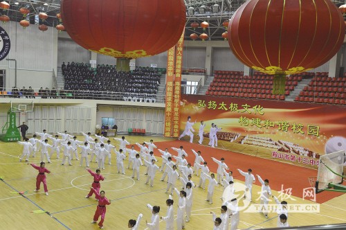 弘扬太极文化,构建和谐校园。日前,市第十三中学全体师生以一场宏大的校园太极文化节迎接2013年的到来。 “练太极拳,除了能强身健体,还能修身养性。”校长金丽红说,针对学生在日常学习生活中表现出的烦恼、急躁情绪影响学习效率的情况,第十三中学将太极拳列入学校特色校本课程,太极拳、太极功夫扇、太极剑、太极推手……融入到平常的体育教学和课余生活中。通过习练太极拳,学生们缓解大脑的疲劳,提高了学习效率,释放了学习压力,同时,太极文化和谐包容、刚柔相济的思想,对涵养学生品格心性也起到积极的作用。 |