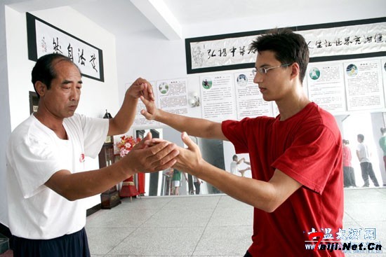 | 陈家沟家庭武校拳师陈照森在指导瑞士学员习练太极拳 8月15日,在太极拳发源地温县陈家沟村陈照森的家中,来自瑞士的太极拳爱好者石俊清用生硬的中国话说:“在这里学拳很好,每天都和老师生活在一起,不仅随时能够受到指点,还有一种家的感觉......”近年来,许多太极拳爱好者来到陈家沟选择这种家庭式武馆学拳。