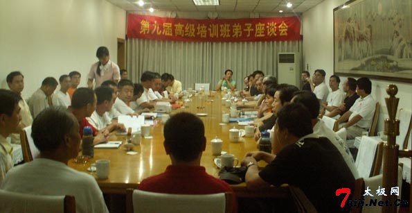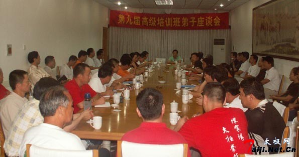 昨天晚上20:10在城饭店一楼6号会议室,陈正雷大师召集参加本次高级培训班的45名弟子座谈会。在大师主持下,大家各自汇报了推广情况,并热烈地讨论了对以后发展的想法。 少帅陈斌着重提出了关于“2008年 迎奥运.陈正雷太极人生六十年系列活动”的设想;陈正雷大师出生于武术世家,年少多受挫折,然凌云志之不改,全面系统地继承了家传太极, 数十年来大力弘扬,无异他是一个成功的人,堪称陈氏太极拳中兴之人;漫漫人生六十年,大师的技艺、德操、风范值得我们去积极回顾,以此激励大家的信心,纠正发展方向,更好的让太极拳服务全人类。少帅的提议得到所有师兄弟的积极响应,大家纷纷提出自己的想法、建议;并表明有信心把这一系列活动举办好! 会议持续进行到23:00左右结束。陈大师提出了次日早上教众弟子学习自己创编的“太极剑十八式”。