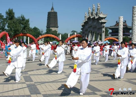 8月22日,太极爱好者在辽阳市中华广场表演太极剑。当日,辽宁辽阳举行迎奥运全民健身展示活动,数百名太极爱好者到场进行了太极拳、太极剑等精彩的表演。