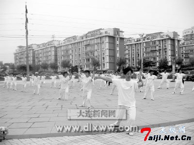 大连甘井子区泉水街道居民在积极迎接奥运会的日子里,又喜闻达沃斯即将在大连召开,为了全面展示一下泉水居民的体育运动风貌,阳光社区和奥林社区联合组织了一次与奥运同行与达沃斯牵手的太极拳、扇的展演.