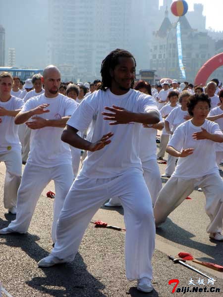 刚刚送走参加夏季达沃斯年会的中外贵宾,又迎来了万人太极拳大展演。昨天的星海广场,让每个人都感觉到身为“龙的传人”的振奋与自豪。8时半,市人大常委会主任李永金宣布万人太极拳展演开始,上万名武术爱好者人人一身翩翩白衣,在太极乐的伴奏下演练了24式简化太极拳、32式太极剑及太极功夫扇,动作整齐划一,气势磅礴,让人震撼。 队伍中,黑皮肤的史乐飞、剃光头的泰德、金头发的劳拉格外引人注目。他们三位都是美国人,泰德和史乐飞是来大连学汉语的留学生,而劳拉则是大连交通大学的外教。大连天罡国际太极拳交流中心阎树栋教练颇为自豪地告诉记者,3位老外都是他的学生。“史乐飞是位忠实的中国武术迷,早在来中国之前,就已经在美国练了7年武术。为取‘真经’,史乐飞一年前来到中国大连,他目前武龄8年,水平相当高。史乐飞学武术的目的是要回国开武馆,教授更多的热爱中国武术的美国人。与史乐飞相比,劳拉和泰德的武龄较短,不过三四个月。” 此次万人太极拳展演由市体育局指导,市武术协会主办,中共大连市委统战部、星海湾管理中心、金生房地产开发有限公司、市风景园林处等相关单位协办。市武术协会名誉主席、70多岁的阎子奇老先生介绍说,粗略统计,目前大连习武人士超过了10万人,拥有大小武馆几百家、武校近20家。几年前开始,市武术协会组织会员通过万人太极拳展演的形式,扩大武术的影响力。近两年,市体育局对此活动加以规范指导,使之制度化,在每年的夏天举行。