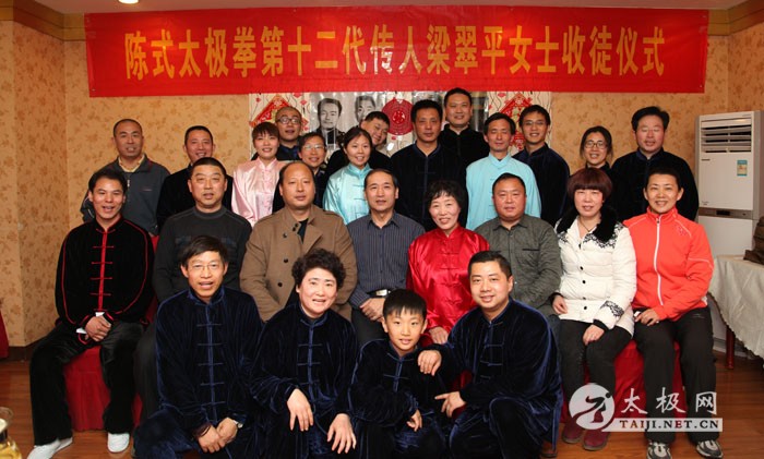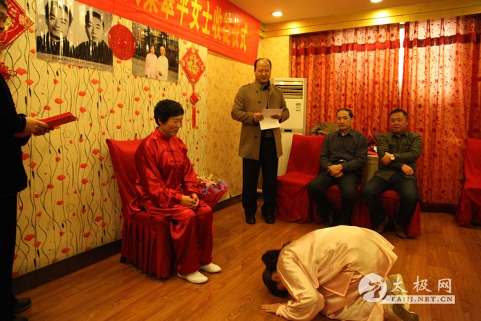 太极网简讯:2014年3月8日,北京太极拳名家梁翠平老师喜收新徒。梁翠平老师是西城区财政局干部兼管工会工作,自上世纪90年代开始从事全民健身活动,1994年成立“奇石馆辅导站”并任站长,带领本单位和其他中央单位、区直属机关、企事业单位数百人晨练,免费学习太极拳、太极剑、太极扇等健身项目,为当地的社会体育事业做出来很大贡献。 梁翠平2004年开始接触陈式太极拳,后拜太极拳大师马虹先生为师,系统、完整的学习继承了马虹老师的太极拳技艺。 本次十名弟子拜师,也是梁翠平老师收的第二批弟子,他们都是工作在各个岗位,有的是夫妻、有的是父子(母女)相互熏陶,逐渐爱上太极拳的。西城区体育局、武协的负责人,太极拳发源地温县太极拳传承人联合会主席刘洪奇,河南太极国旅总经理张惠芳女士应邀前来祝贺。马虹老师的得意弟子、石家庄市武术协会陈式太极拳专委会理事长杨合发先生主持收徒仪式。 仪式结束后,杨合发老师为大家讲授了陈式太极拳技术要领,针对部分太极拳爱好者习练中的问题做了详细解答和示范,受到大家的热烈欢迎。