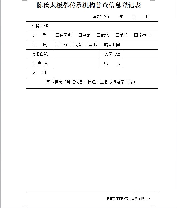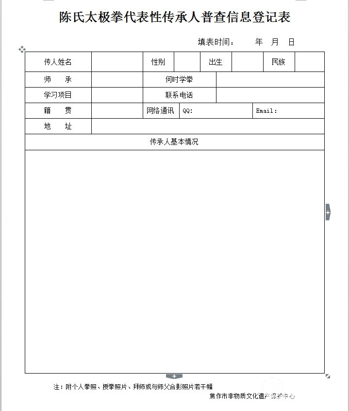 2013年5月—9月,根据上级部署,为全面摸清近年来各级太极拳传承人工作开展情况,进一步完善太极拳数据库和传承谱系工程建设,组织开展了陈氏太极拳传承情况普查活动。经过前一阶段的积极工作,搜集整理了大部分传承人的信息,但仍有一部分传承人未能及时申报和提供资料。 经研究,决定对普查情况进行进一步的补充,现采用表格的方式填报,简化填报形式,望还没有申报的各级传承人抓紧时间填报。登记表分为个人和机构两份表格,开办有拳馆、养生馆、武校、协会的除填报“个人信息普查信息登记表”外,还要填写“机构信息普查登记表”,以电子文档(包括照片)的形式传送到太极网,截止日期为七月底。 本次普查不收取传承人任何费用,普查信息将录入太极拳国家数据库,请珍惜机会! 请四位国家级传承人陈小旺、陈正雷、王西安、朱天才,三位省级传承人陈小星、陈照森、陈庆州的弟子抓紧填写《陈氏太极拳传承普查登记表》,在5月底前报送,也可以和各自的老师及其办事机构联络,统一报送。 表格下载: