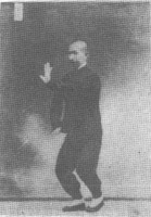 | 图25 先将左足尖欠起,足后根亦如螺丝之意,往里扭转,足之形式,与左式转右足根之形式相同,再将右手往右边,斜着搂一弧线,大指二指撑开,如半月形,搂至大指离右胯一二寸许,再将左手心向上着,往上抬起, 起至与左肩相平,手心再向里 图25倒辇猴(右式)着,五指张着,食指梢亦从左口角往前推去。两手之形式,两足之距离,周身之动作,内外之气劲,均与左式相同,左右循环之式,数之多寡,各听其便,不拘一定。(见图25) |