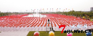龙腾狮跃庆盛世,太极神功耀寰宇。昨日傍晚,世纪莲体育中心东广场万人欢腾,近2万市民表演集体武术,庆祝“2007佛山旅游文化节”开幕,其排山倒海的气势蔚为壮观! 东平新城万人欢腾,世纪莲花盛情绽放。在市委书记林元和宣布2007佛山旅游文化节开幕后,近2万名来自全市五区的市民先后表演了“龙腾狮跃迎盛世”、“巾帼须眉竞风流”、“传统武术展新姿”、“太极神功耀寰宇”4个集体节目。88头南狮和10条巨龙欢腾跳跃,分外喜庆;男女老少挥拳舞扇,气势恢弘……尤其是1.8万名武术爱好者集体表演太极拳,场面十分壮观。从南往北看去,排列整齐的老老少少似一条银色锦带从东平桥上铺开,环绕世纪莲,气贯长虹。 在这群参演的民众中,有职工、干部、学生,也有退休人员、外籍人士等。其中,年龄最大的70多岁,最小的才5岁。上海大世界基尼斯总部代表亲临现场见证了万人舞太极这一活动盛况,并现场授予“上海大世界基尼斯之最记录”牌匾。