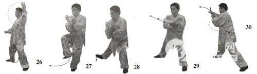 6.举拳提膝 左腿支撑身体,右腿屈膝上提,脚尖微翘起。同时右掌变拳屈臂上举至与鼻同高,拳心向内,拳面向上;左掌落至腹前,掌心向上。目视右拳(图20)。 7.震脚砸拳 接上动,右脚向下在左脚内侧踏地震脚,两脚相距约20厘米。同时,左掌外旋,掌心向上;右拳下落,以右拳背砸击左掌心。目视前下方(图21)。 〔练习要点〕 向左转身掤捋时,要稍向右下转身画弧。转身右捋时,要稍向左上转身画弧。擦脚平推时的左脚擦地铲出与两手向右前画弧平推,虚步撩掌时的右脚向前上成虚步与右掌的前上撩,震脚砸拳时的右拳砸击与右脚下踏震地动作,均要协调一致。同时,两手的内旋、外旋,要有内含的缠丝劲。右脚踏震时,要屈膝松胯,全脚掌着地。震脚砸拳时,上体要保持正直,不可前俯后仰或左右歪斜。 〔呼吸方法〕 转体捋掤时吸气,转身右捋时呼气;擦脚平推的捋掤提脚时吸气,擦脚平推时呼气;虚步撩掌时吸气,虚步砸拳时呼气;举拳提膝时吸气,震脚砸拳时喷气(气以鼻中短促有力地排出,以下均同)。 〔意念方法〕 导引法:转体捋掤时意想气由两手行至丹田;转身右捋时想象丹田内气行至两手。捋掤提脚时意想气由两脚涌泉穴沿两腿内后侧(足三阴经)上行,经会阴穴至丹田(以下简称为两脚至丹田);擦脚平推时,想象内气由丹田向下,经会阴沿两腿外前侧(足三阳经)向下至两脚涌泉穴(以下简称为丹田至两脚)。虚步撩掌时意想气由两手行至丹田;虚步砸拳时想象气由丹田行至两手。提膝举拳时想象内气由两手沿两臂外侧行至百会穴(以下简称为气由两手行至百会);震脚砸拳时想象内气由百会穴沉入丹田。 观想法:转身掤捋和转身右捋时,想象随两手的捋动整个宇宙被搅得天翻地覆、天昏地暗。擦脚平推时,想象脚下好似擦出一条河,掌像推翻一座大山飞速滚向天边。虚步撩掌与虚步砸拳时,想象巨大山体被轻托举起,随拳下砸,使巨大的山体沉入海底。提膝举拳时,想象将地球轻松自如地上提举起;震脚砸拳时,想象脚一踏可震破大地,拳一砸可粉碎巨大的山体。 技击法:设想对方用右拳向我面部击打而来,我右手黏其来拳之腕,左手黏托住其来拳之肘,顺其来劲向右捋推,同时用左脚从对方右腿前绊住向右擦脚使其前跌。当对方后抽右拳时,我借劲用左臂掤击其两臂,并用右掌撩其裆部,接着顺势变拳向上冲击其下颌,用右膝撞其裆,然后再用右脚下踩其左脚。 三、揽扎衣 〔动作歌诀〕 胸前开合阴阳变,转腰旋臂劲内含。 左采右挤随势靠,立身塌腕掌下按。 〔动作方法〕 1.分掌画弧 紧接上势,上体向前、向右旋转,随转腰左掌托右拳向前、向右画 弧。目视右前方(图22)。 上动不停,上体继续向后、向左前旋转,随转腰左掌托拳向后、向左前画弧。目视左前方(图23)。 紧接上势,上体向右转,右拳变掌,手臂内旋使两手臂交叉于胸前, 右手在里内旋、手心向外,左手在外下、掌心向里。目视前方(图24)。 身体继续向右微转,身体重心偏向于右腿。右手向上、向右画弧至右肩前上方,掌心向前,指尖向上;左手向下、向左画弧至左胯旁,掌心向右,指尖向前。目视右前方(图25)。 上动不停,身体稍左转,重心稍向左移。同时,右掌向下、向左画弧至右肋侧前旁,掌心向下,指尖向右;左掌向上、向左画弧至左头侧旁,掌心向右,指尖向上。目视前方(图26)。 2.擦脚合臂 紧接着,身体重心全部移至左腿,左腿支撑身体,右腿屈膝向上提,脚尖自然下垂。同时,左掌向右、向下画弧至右胸前,右掌向下、向右上画弧至左胸前,两掌交叉于胸前,左掌在里,右掌在外,两掌掌心均向里,指尖均斜向外。目视右掌方向(图27)。 身体稍向左转,左腿屈膝下蹲,右脚以脚跟内侧贴地向右铲出。同时,两掌交叉于胸前稍向左前撑。目视右前方(图28)。 3.马步立掌 右脚前掌着地踏实,重心开始右移。左掌内旋翻成掌心向外,指尖斜向上,两掌仍交叉于胸前。目视前方(图29)。 上动不停,身体重心右移,上体右转。随转体,右掌向上、向右画弧至右肩前,掌心向前,指尖斜向左;左掌附于右大臂内侧,掌心向右,拇指侧向里。目视右掌方(图30)。 身体重心继续右移成右偏马步,上体随之向右转体。随转体右手向右下画弧至右侧方,前臂外旋,塌腕立掌,掌心向右,指尖向上,腕与肩同高;左手向下、向左屈肘叉于左腰侧,虎口向里,掌心向下。目视右手(图31)。 〔练习要点〕 在整个揽扎衣动作过程中,身法的变换是向左、向右的两个“回旋”,同时以腰转动带动两臂左右缠绕。右脚铲出与两手胸前搭腕要协调一致。揽扎衣动作定势时,沉肩垂肘,旋臂塌腕,敛臀圆裆,松腰沉胯。 〔呼吸方法〕 分掌画弧时吸气,擦脚搭腕时呼气。身体左转、马步立掌前的右掌内旋时吸气,马步立掌时呼气。 〔意念方法〕 导引法:分掌画弧时想象气由两掌行至丹田,擦脚搭腕时想象丹田内气行至两脚,马步立掌前的右掌内旋时想象气由两脚行至丹田,马步侧掌时想象丹田内气行至两掌。 观想法:分掌画弧时,想象宇宙被两臂缠绕旋转起来。擦脚搭腕时,想象脚下擦出一条大河,日月星辰被揽抱于怀中。马步侧掌时,想象大山被推按塌陷于地球之中。 技击法:设想对方左拳向我打来,我用右臂由里向外拦挡其臂,左手抓握其手腕,上步近身,顺势用肩靠肘顶,手扑其面部。 四、六封四闭 〔动作歌诀〕 六封四闭捋采变,捋展掤合两掌间。 上引下松气随意,跟步闭中双掌按。 〔动作方法〕 1.转