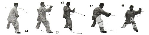 紧接着,身体微向右转,左脚以脚跟内侧贴地向左前方铲出;两臂里裹,仍交叉于腹前。目视左前方(图64)。