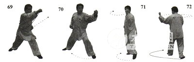 上动不停,身体继续右后转,右脚外摆,左脚继续扣脚向右弧形上步。同时,左臂随转身向右后格肘于左胸前,拳心向里,拳面向上。目视左肘方向(图72)。