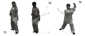 再接着,利用惯性上体继续右转。同时,两拳向右下摆于右腹前。右拳拳心向上,拳眼向外;左拳拳心向上,拳面向前。目视前方(图74)。